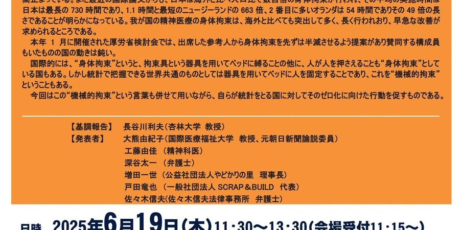 身体拘束ゼロ・機械的拘束ゼロを目指し要件の拡大を止める院内集会 イベント詳細 日付: 2025年6月19日 カテゴリ: 関東 Tweet Pocket 6月19日(木)11:15受付 11:30~13:30 会場:参議院議員会館 102会議室 参加費 主催:精神科医療の身体拘束を考える会 連絡TEL Tweet Pocket 関連